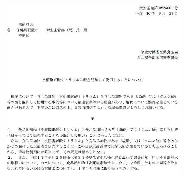次亜塩素酸水の空間噴霧の安全性について、現時点で目安になる安全基準は「労働安全衛生法」に定める塩素ガスの許容濃度である。これが具体的には500ppbという値であるが、この基準は「人が1日8時間、週40時間、曝露されても人の健康に害がない」濃度とされている。塩素濃度50ppmの次亜塩素酸水を想定されている噴霧量より大幅に多い、過剰噴霧(湿度≒100%)した実験でも、計測された最大値は120ppb程度であった。健康上、問題が無い濃度である。また、噴霧粒子の吸引毒性に関しては、げっし動物を用いた数多くの吸引毒性試験で安全性を確認している。(福崎教授)